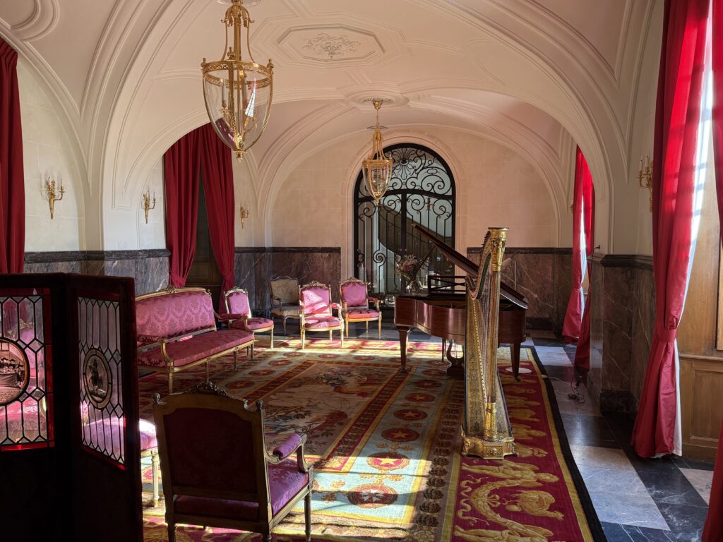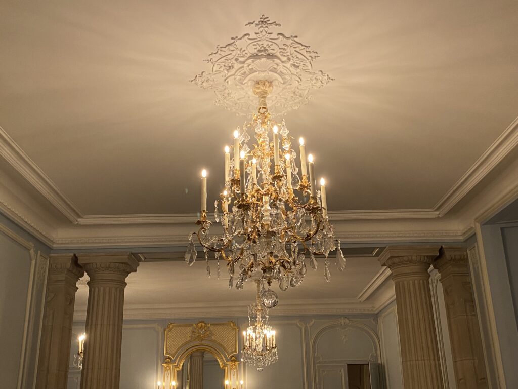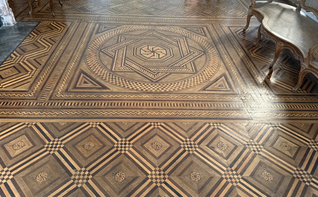 La restauration de la marqueterie du grand salon a fait l’objet d’une travail remarquable par les Ateliers de la Chapelle, basés en Maine et Loire. Très abimée, elle a été démontée morceau par morceau avec une grande patiente et entièrement travaillée en atelier.